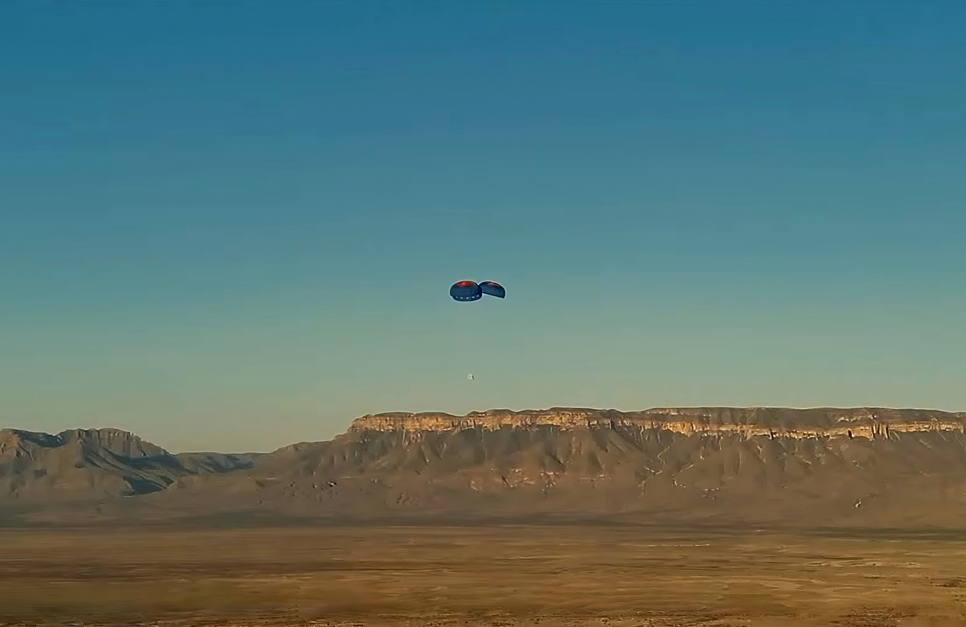 The New Shepard crew capsule descends to the West Texas desert during Mission NS-34. (August 3, 2025)